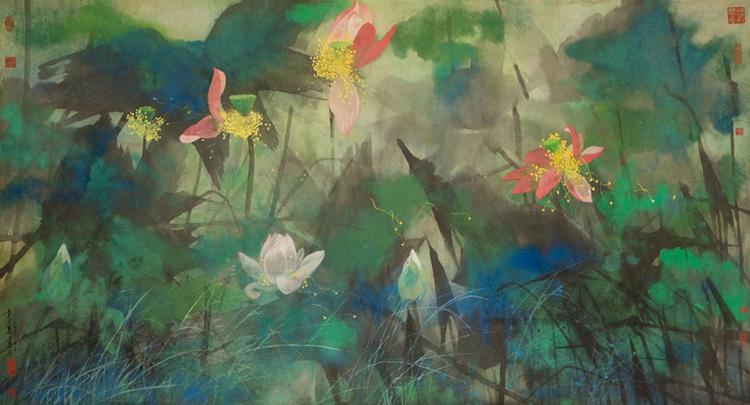 為了展現(xiàn)中華名族的蘇繡文化,蘇繡的作品開始進入國家政治場所,在人民大會堂有蘇繡的作品,蘇繡也不僅一次的作為外交禮品贈與國外元首。隨著香港回歸祖國,外交部駐港機構(gòu)也需要裝飾布置。為了體現(xiàn)我國的優(yōu)秀傳統(tǒng)文化,有關(guān)部門決定采用四大名繡之一的蘇繡作為該機構(gòu)貴賓室內(nèi)的陳設(shè)品。選用的畫稿是由中央工藝美術(shù)學(xué)院教授袁運甫設(shè)計的《彩墨荷塘》,這幅畫采用虛實亂針繡和平針中各種針法相結(jié)合的多種針法,既見粗獷筆墨,又有細致刻畫,精心繡制成雙面異色亂針繡《彩墨荷塘》,高1.1米。寬2.3米。原作以大膽老辣的中國傳統(tǒng)潑墨和西洋絢麗濃艷的色彩,描繪了一副生機黯然的荷塘景色,繡工使用了五百多種色線,真實地反映了原作的精髓,既強調(diào)了光色效果,又很好地處理了虛實搭配。繡面上粉紅色、白色的荷花亭亭玉立,金黃色花蕊中幾支嫩綠色的蓮蓬清香遠溢,碧綠的田田荷葉在深藍底色的烘托下色彩交相滲透,枝干、細草、慈姑葉有的掩映在荷葉中,有的錯落有致地呈現(xiàn)在荷葉叢間,富有生氣地展示了仲夏荷塘的清麗之美。這還是至今最大的雙面繡亂針作品。