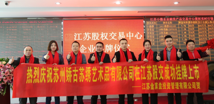 ?? 2016年12月9日,蘇州嬌古蘇繡藝術(shù)品有限公司掛牌上市儀式在江蘇股交中心隆重舉行。簡稱“嬌古蘇繡”,股權(quán)代碼“690901”。伴隨著莊重而響亮的鑼聲,嬌古邁出了跨越式的一步。???? ?? 就嬌古蘇繡掛牌成功,公司董事長張奇?zhèn)ハ壬硎尽肮纠響?yīng)將完善企業(yè)治理機(jī)構(gòu),提升企業(yè)競爭力放在首位,不辜負(fù)資本市場對嬌古的認(rèn)可及支持。這也是公司一個(gè)飛躍式進(jìn)步,一個(gè)重要里程碑。嬌古員工們將其作為強(qiáng)大的動(dòng)力,更好、更快的為廣大客戶服務(wù)。規(guī)范和健全企業(yè)發(fā)展機(jī)制,是我們的目標(biāo)。但我們相信,掛牌成功,對企業(yè)的規(guī)范化、影響力有著不可小覷的力量。在此,我僅代表全體公司人員,感謝股交中心長期以來的支持與信任,感謝所有工作人員辛勤的付出!”