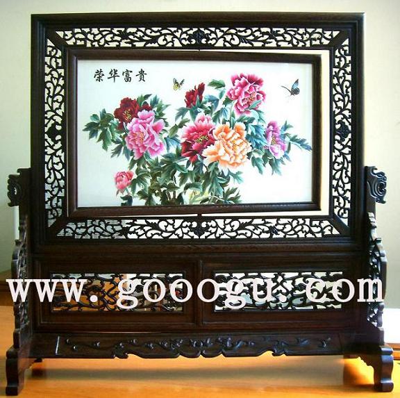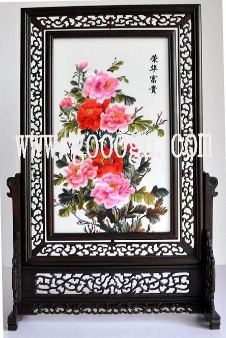 鳳穿牡丹雙面繡臺屏|檀木雕花架刺繡屏風(fēng)|刺繡工藝品