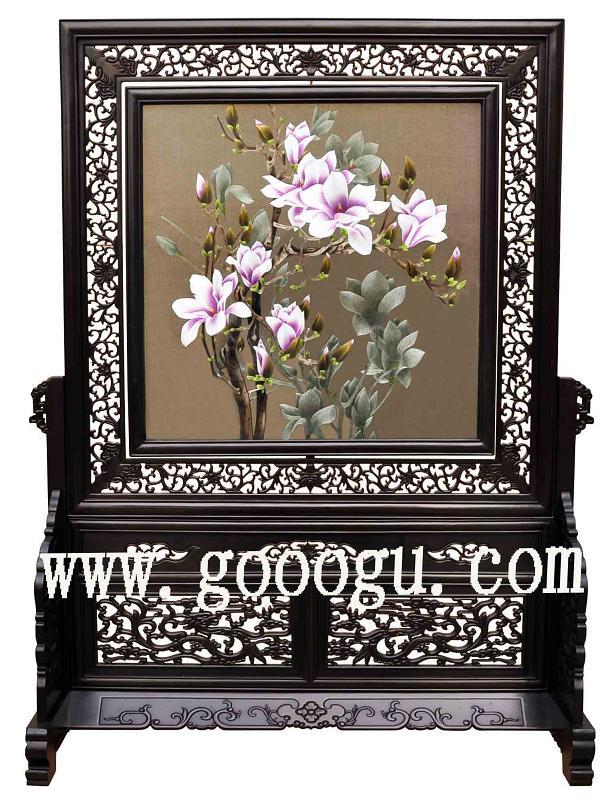 玉蘭花細(xì)節(jié)照(局部圖) 產(chǎn)品名稱:40X40CM紫檀蘇繡雙面繡 (作品代碼:SY-488) 產(chǎn)品規(guī)格:刺繡圖案尺寸 40X40CM 外框整體尺寸最寬處65CM,高85CM 產(chǎn)品工藝:蘇州繡娘手工刺繡。繡品圖案部分可360度旋轉(zhuǎn) 產(chǎn)品材質(zhì):真絲面料+桑蠶絲線+玻璃+紫檀木架 產(chǎn)品包裝:錦盒禮品裝 嬌古出廠價(jià):收藏級(jí)別,限量發(fā)行,嬌古蘇繡參考價(jià),22000元 最小起訂量:1件----廠家直銷,可當(dāng)天發(fā)貨(可混配圖案) 產(chǎn)品描述:【40X40CM檀木雙面繡】蘇州雙面繡為蘇州刺繡工藝師純手工刺繡而成,木框材質(zhì)為紫檀,整體框架花紋雕刻細(xì)膩。圖案有花卉(牡丹,梅花,荷花,蘭花等),花鳥,動(dòng)物(熊貓,老虎,魚等),山水,風(fēng)景,名家字畫等。圖案多達(dá)一百多種,有古色古香的,有現(xiàn)代氣息的,高貴典雅,是贈(zèng)送客人的特色禮品之一。此款選取嬌古蘇繡資深高級(jí)工藝師歷時(shí)半年精心刺繡而成,每款題材的繡者均是專攻山水、牡丹或相關(guān)題材達(dá)數(shù)十載之久的專業(yè)技師。全國(guó)每年發(fā)行一件。歡迎收藏!