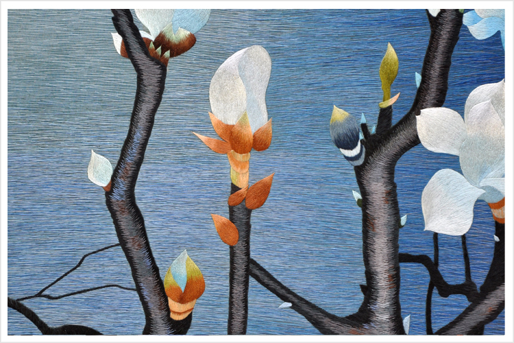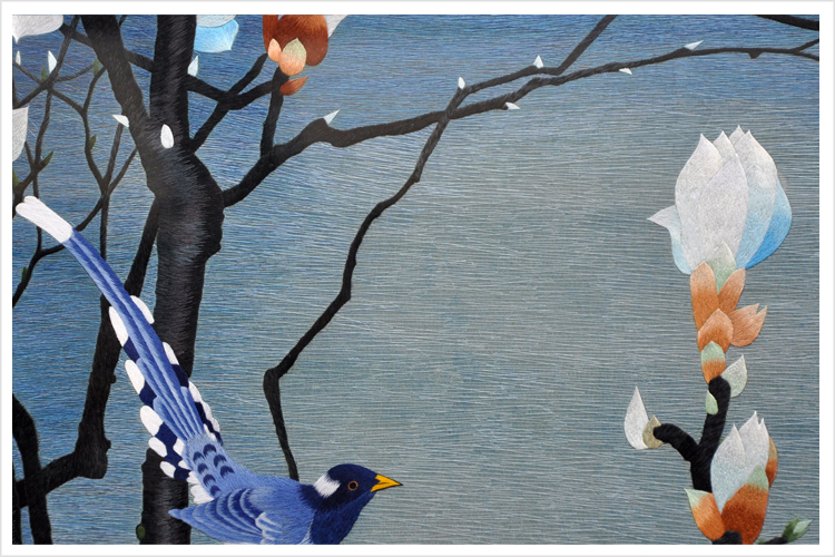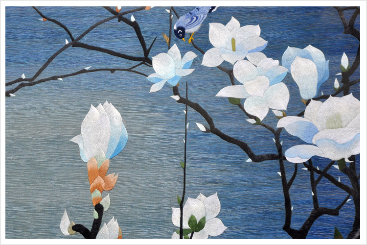 【品 牌】:嬌古 (作品代碼 D-1039) 【品 名】:玉蘭花鳥裝飾畫(手工蘇繡) 【品 質(zhì)】:1-2絲刺繡 (蘇繡小知識(shí):1根蘇繡絲線可分為16絲,中檔刺繡皆為10絲所繡,中高檔刺繡皆為6-8絲,高檔刺繡皆為4-6絲,精品刺繡皆為1-4絲) 【尺 寸】:畫心尺寸68*68cm 整體尺寸110*110cm 【產(chǎn)品工藝】:手工刺繡+真絲底料 【絲線材質(zhì)】:蠶絲線 【用 途】:居家裝飾及政府禮品、外賓禮品、生日禮物、賀壽禮品、領(lǐng)導(dǎo)升遷、出國(guó)禮品等等。 【出廠價(jià)格】:55000元 細(xì)節(jié)圖