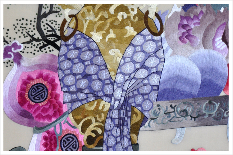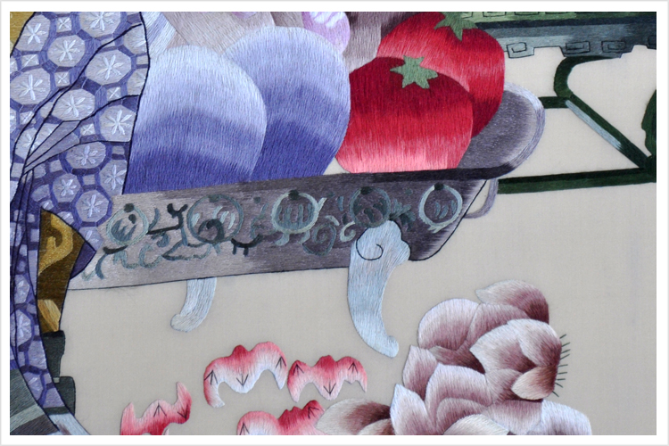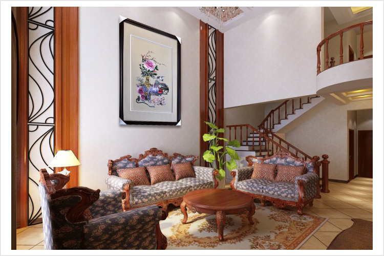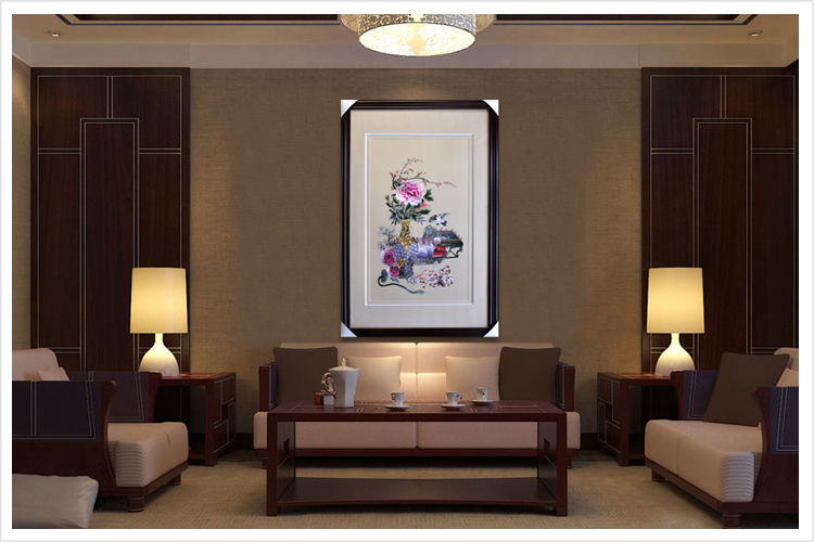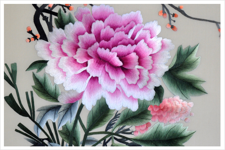 【品 牌】:嬌古 (作品代碼 D-1032) 【品 名】:吉祥富貴裝飾畫(手工蘇繡) 【品 質(zhì)】:2-4絲刺繡 (蘇繡小知識:1根蘇繡絲線可分為16絲,中檔刺繡皆為10絲所繡,中高檔刺繡皆為6-8絲,高檔刺繡皆為4-6絲,精品刺繡皆為1-4絲) 【尺 寸】:畫心尺寸53*83cm 整體尺寸77*113cm 【產(chǎn)品工藝】:手工刺繡 【絲線材質(zhì)】:蠶絲線 【用 途】:居家裝飾及政府禮品、外賓禮品、生日禮物、賀壽禮品、領(lǐng)導升遷、出國禮品等等。 【出廠價格】:12000元 【細節(jié)欣賞】