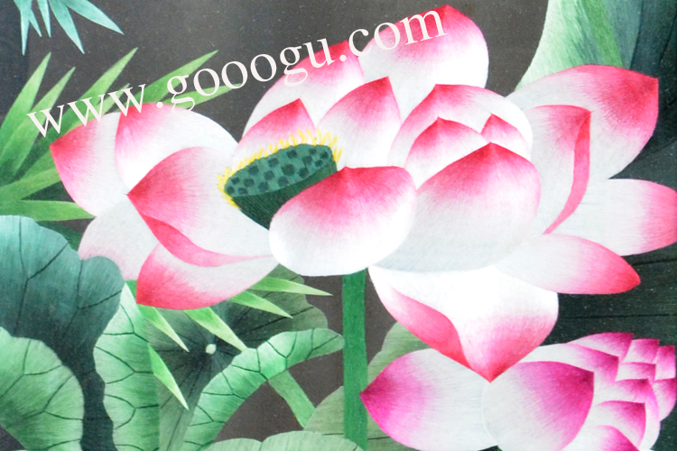 荷花細(xì)節(jié)特寫、繡工精致、顏色的過渡漸變自然