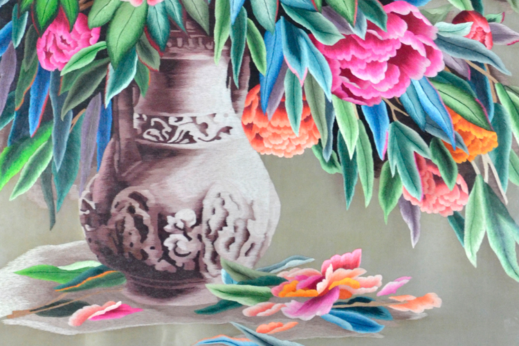 【產(chǎn)品名稱】:花瓶牡丹屏風(fēng) (作品代碼:P-1099) 【產(chǎn)品規(guī)格】:圖案尺寸為寬70cm,高110cm 外框整體尺寸寬130cm,高205cm 【產(chǎn)品工藝】:手工刺繡 【產(chǎn)品材質(zhì)】:真絲面料+雞翅木框+桑蠶絲線+玻璃 【產(chǎn)品包裝】:木箱包裝,用海綿包扎,確保運(yùn)輸安全 【出廠價】:18600元 【產(chǎn)品運(yùn)輸】:我司負(fù)責(zé)發(fā)往客戶指定地點(diǎn),蘇州附近城市可送貨上門! 【產(chǎn)品說明】:此款雙面繡屏風(fēng),是由蘇州工藝師耗時三個月精心手工刺繡而成,刺繡圖案以象征富貴平安的牡丹花瓶為題材繡工精細(xì),顏色搭配均勻過渡自然,整體給人舒適,愜意之感,屏風(fēng)的框架選用雞翅木為料,是蘇繡屏風(fēng)中的經(jīng)典作品。是家用玄關(guān)或辦公室玄關(guān)的禮品!歡迎親臨嬌古蘇繡展示廳觀看實(shí)物! 【作品欣賞】 .jpg)